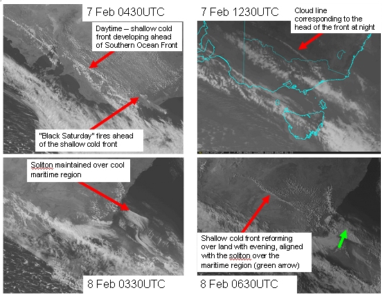 The evolution of the Type 2 front corresponding to the “Black Saturday Bushfire” event is shown in visible and infrared imagery below. A line of cumulus marks the region of surface convergence and frontogenesis. The broad cloudband corresponding to the Southern Ocean front is seen to the southwest. The eastward progression of the shallow front can thus be monitored using visible imagery during the day and infrared imagery during the night, provided there is sufficient low level moisture available to maintain the cloud line along the nose of the front. In the 0430 UTC image shallow cumulus cloud streets may be observed to develop in the warm northwesterly airstream ahead of the front. Note that the front cannot be detected over land at 0330UTC on the 8th February presumably due to the mixing of dry air through the deep daytime continental boundary layer. However, its progress may be followed over the adjacent maritime region as low level stratiform cloud associated with the passage of a solitary wavetrain.