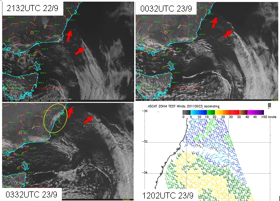 Figure 8: Cloud features associated with the Southerly Buster of 23 September 2011, MTSAT-1R visible imagery and ASCAT scatterometer winds. Red arrows indicate the leading edge of the Buster. The low cloud banking up against the escarpment behind the passage of the Buster is located within the yellow ellipse. Images courtesy JMA and BOM, bottom right image courtesy NOAA/STAR
