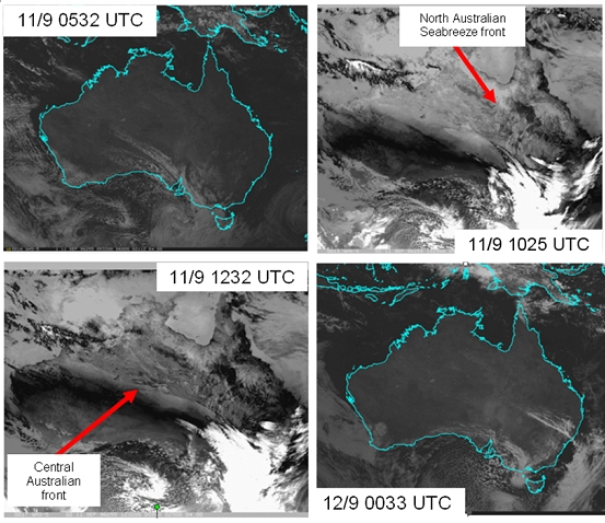 Figure 9: Cloud features associated with Central Australian front event of the 16th September 1991. Images courtesy JMA and BOM