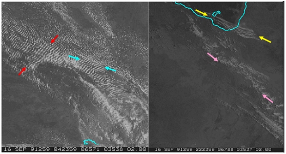 Left-hand side: pre and post frontal cloud streets, blue arrows show pre-frontal cloud streets oriented in a northwesterly direction, red arrows indicate post frontal cloud streets oriented in a southwesterly direction. Right-hand side: the cloud features on the following morning. Yellow arrows annotate the solitons (Morning Glory), pink arrows indicate the approximate position of the surface front. GMS-5 visible imagery.
