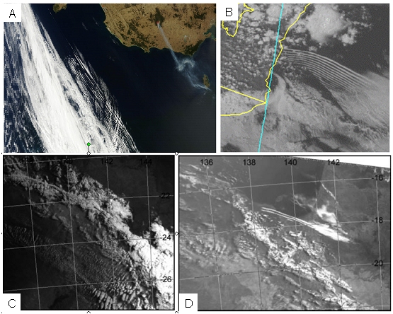 Figure 10: Solitary waves and wave-trains associated with different cold fronts. Top left image courtesy NASA/GSFC Rapid Response, top right image courtesy JMA and BOM, bottom images from Thomsen et al. 2009