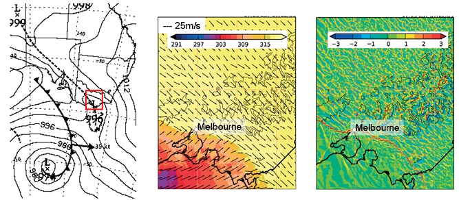 Figure 22: Parameters: MSLP, Potential Temperature, Winds and Vertical Velocity Left image courtesy BOM, centre and right images from Engel et al. 2012