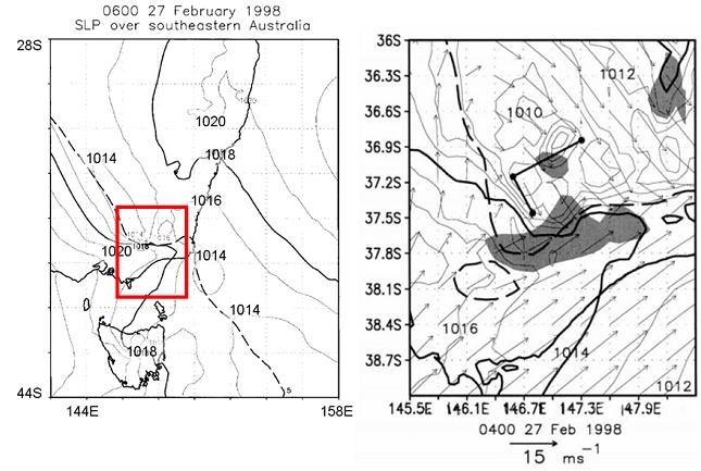 Useful parameters for the Southerly Buster. (LHS) sea level pressure (solid: 1018 hPa, bold), 5 m/s southerly wind contour is dashed, (RHS) seal level pressure (solid: 1014 hPa, bold), wind vectors with scale below, anticyclonic vorticity greater than 10-5 s-1 shaded.