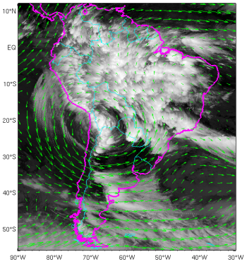 GOES 13 IR 10.7 Image composite for February 1, 2015; vectors: mean wind at 200 hPa.