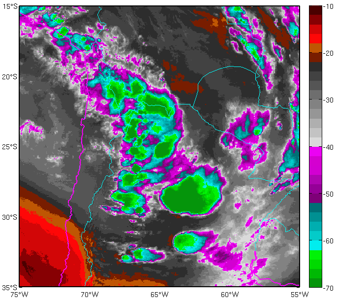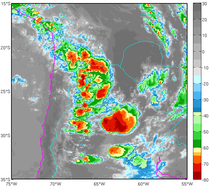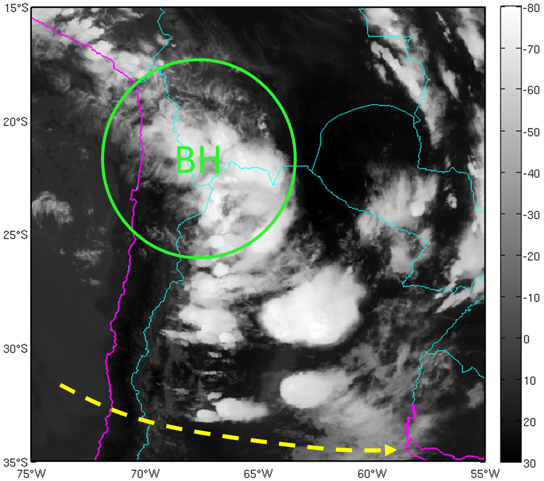 - Convección profunda realzada sobre el norte de Argentina: nubosidad de tipo Cumulonimbus con diferentes grados de organización (celdas aisladas o agrupadas (clusters)) se originan a sotavento en la ladera este de la Cordillera de los Andes producto de las circulaciones locales que se desarrollan durante las horas de máximo calentamiento radiativo. La convección profunda también se intensifica sobre las planicies del Noreste Argentino debido a la divergencia de la AB en niveles altos.