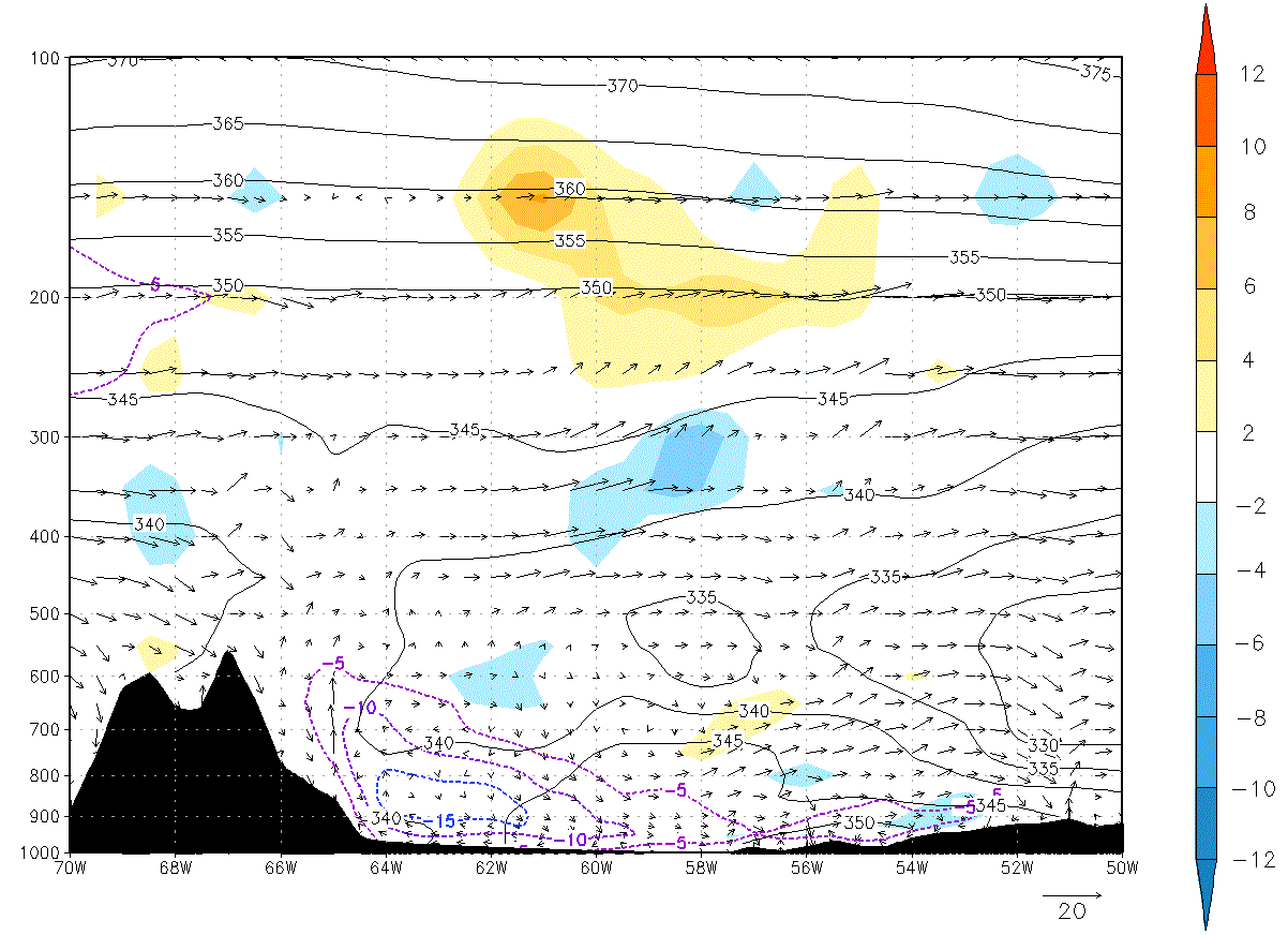 Sombreado: divergencia (10-5 s-1), contornos en negro: temperatura potencial equivalente (K), contornos punteados: viento meridional menor a -5 m/s y flechas: circulación zonal.