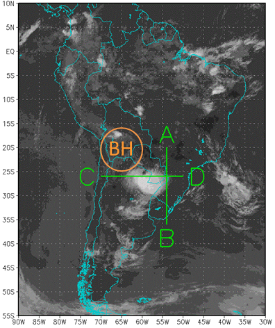 - Viento: la corriente en chorro de capas altas se observa al este de los Andes en 200 hPa