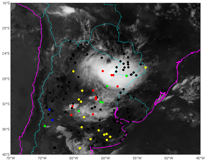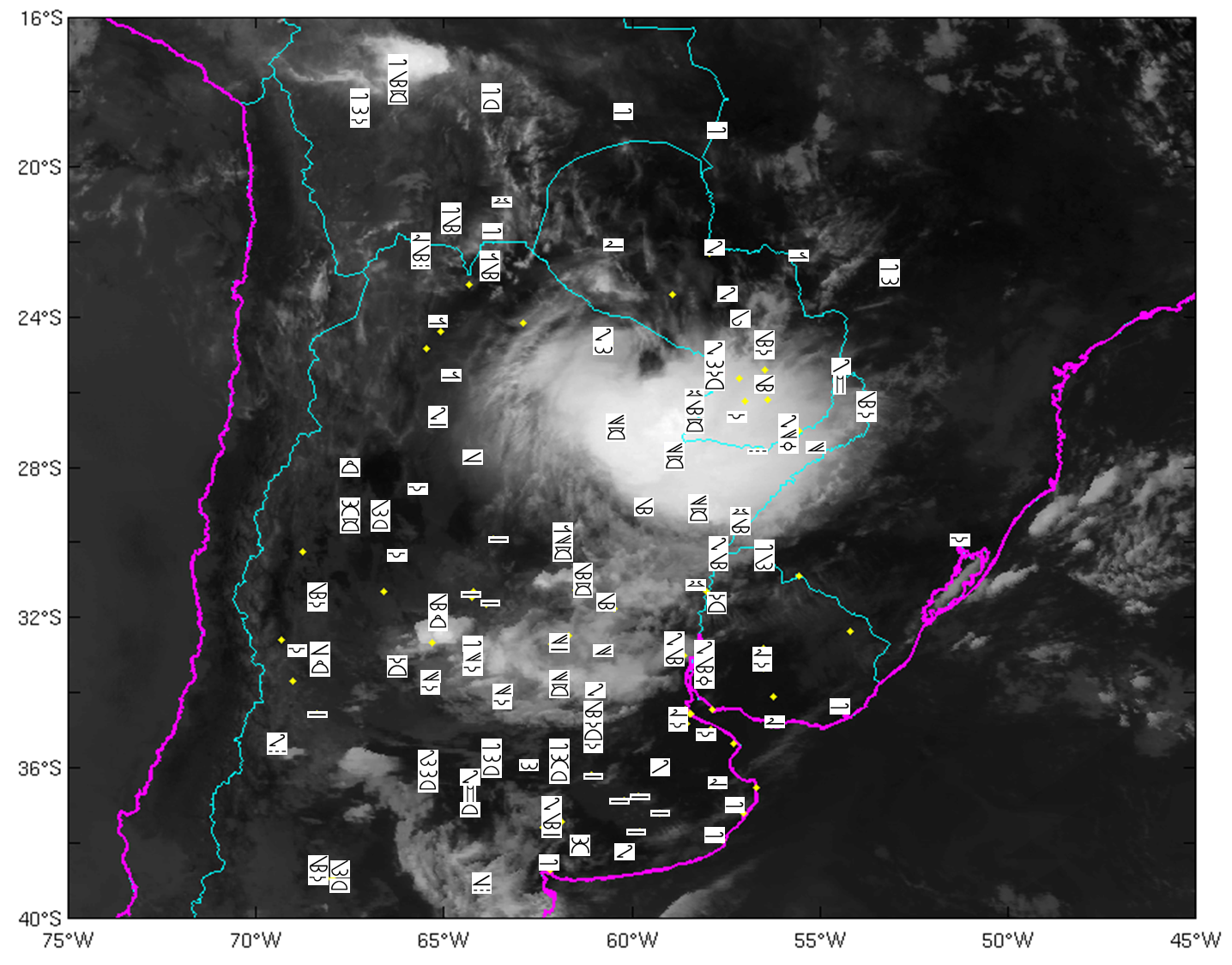 03 Febrero 2015/12:00 UTC - imagen GOES 13 IR 10.7; fenómenos del tiempo (verde: lluvia, azul: llovizna, rojo: tormenta, amarillo: niebla, marrón: polvo,negro: sin precipitación o reporte de tiempo presente). 03 Febrero 2015/12:00 UTC - imagen GOES 13 IR 10.7; observaciones de tipos de nubes de los reportes synop (amarillo punteado: sin reporte de tiempo presente).