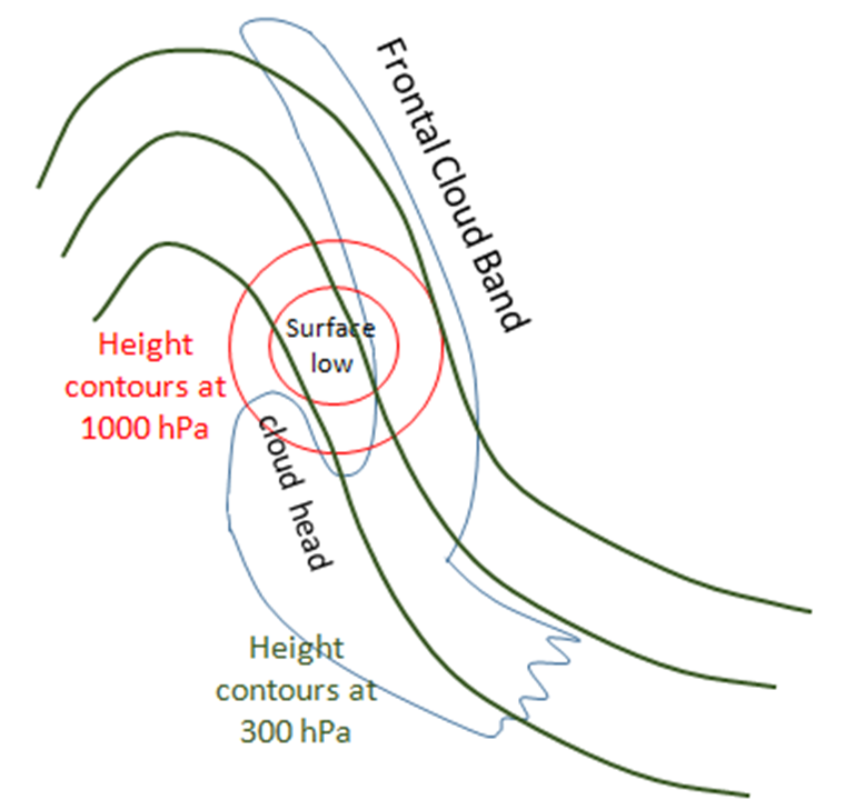 | At higher levels, we can see a jet stream, associated with the cyclone and with cold and warm fronts. During the initial stage of the cyclone development, the jet stream can normally be seen along the rear edge of the frontal cloud band. However, if the low-level temperature gradient is not so intense, the upper-level winds will not be so intense either, and the jet stream will not be present. During the development phase, the jet stream can be observed over the point at which the cold and the warm fronts meet. Later, during the occlusion phase, the jet stream is located on the equatorial side of the cyclone and crosses the triple point, i.e., the point at which the cold, warm and occluded fronts meet.
