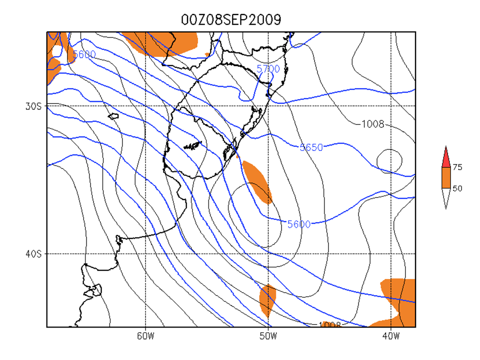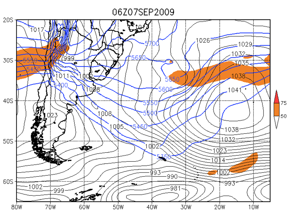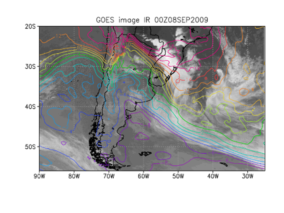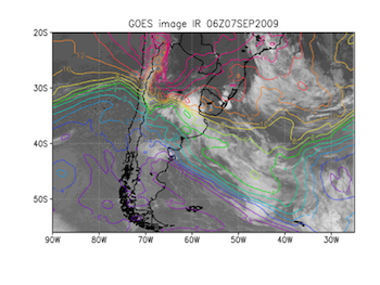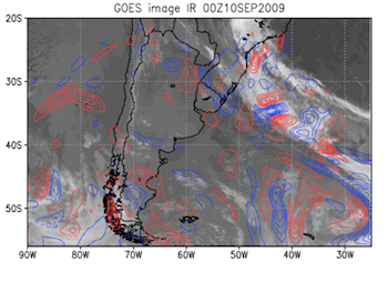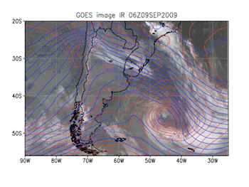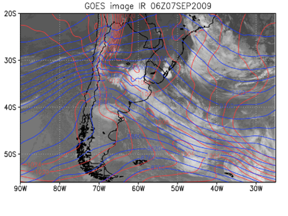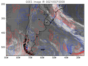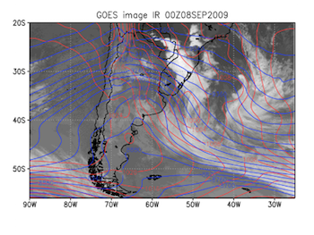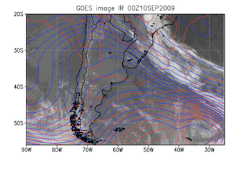 07-10 September 2009. GOES-10 IR channel 4 image. Mean sea level pressure (red contours) and geopotential height at 300 hPa (blue contours).