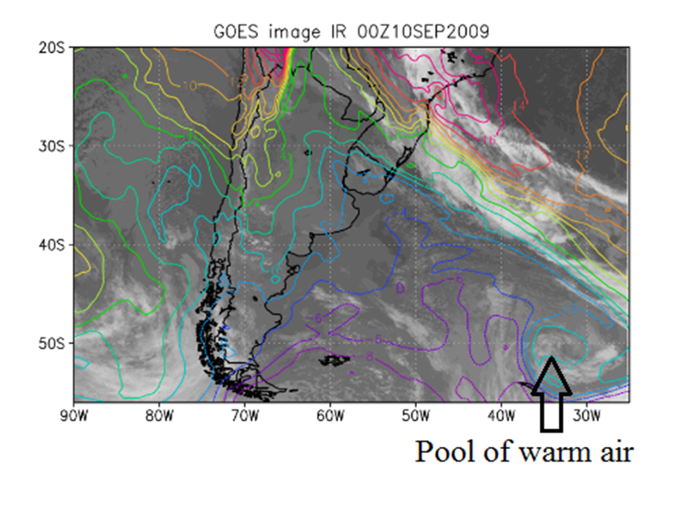 07-10 September 2009. GOES-10 IR channel 4 image and 850 hPa temperature (contours).