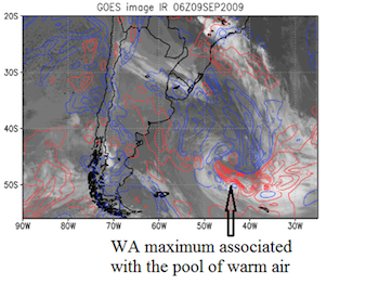 | Sometimes the Andes Mountains can block the cold front and intensify the 850 hPa warm air advection (WA) from the Amazon region to the eastern side of the Andes. This is an important precondition for creating a lee cyclone, although an upper-level trough crossing the Andes is also required. The temperature advection field shows a very distinct wave situation: a maximum of WA within the cloud head and the relevant parts up front, and cold air advection (CA) behind. This pronounced WA/CA dipole is a sign of cyclogenesis in progress. |