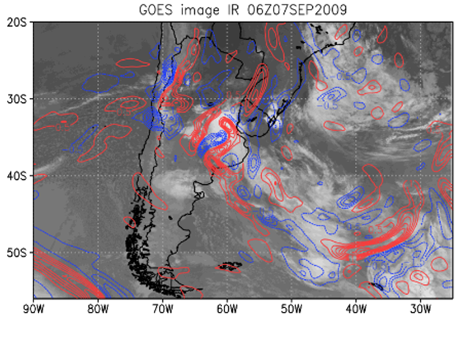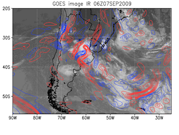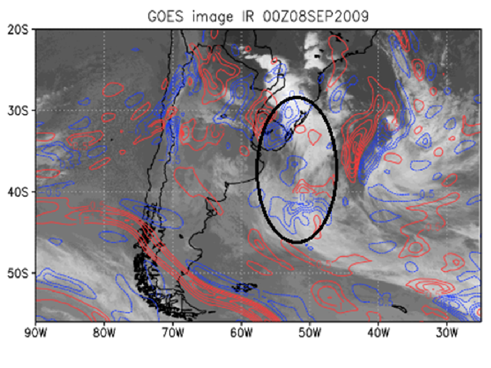 07-10 September 2009. GOES-10 IR channel 4 and horizontal relative vorticity advection at 300 hPa. Positive (anticyclonic) advection (red contours) ; negative (cyclonic) advection (blue contours). The circle indicates the region where the NVA contributes to upward motion.