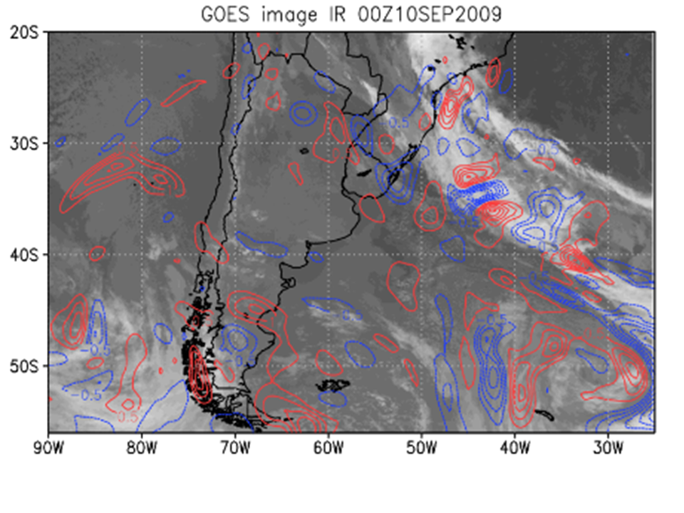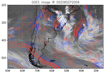 07-10 September 2009.GOES-10 IR channel 4 and horizontal air temperature advection at 850 hPa. Warm advection (red contours); cold advection (blue contours).