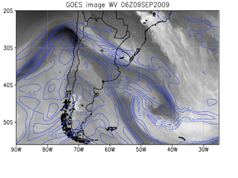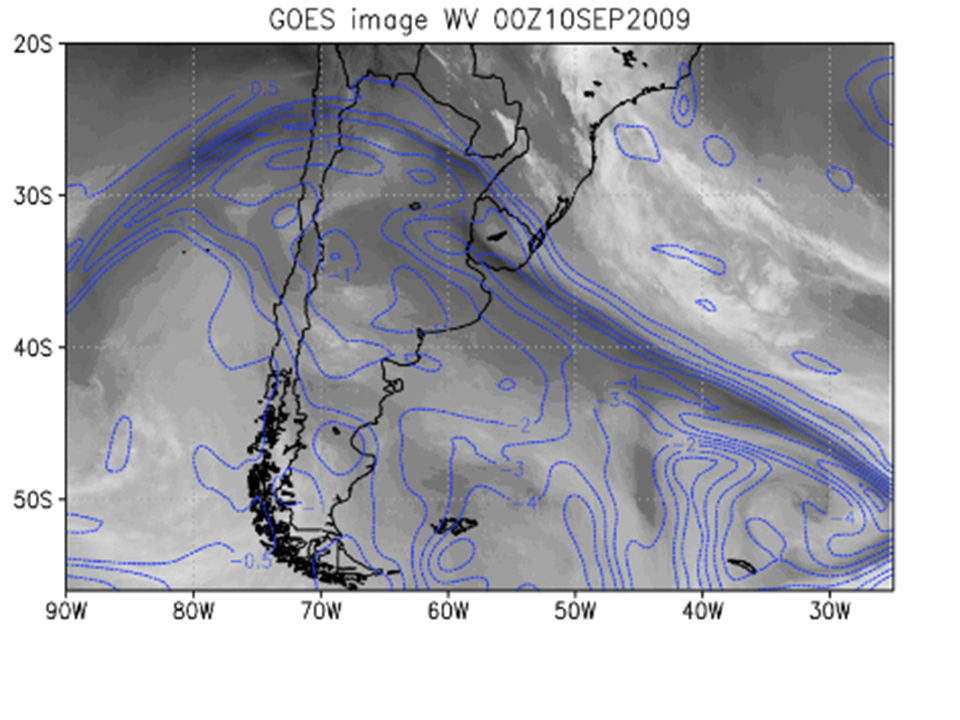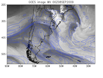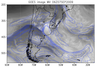 07-10 September 2009. GOES-10 WV channel 3 and potential vorticity at 300 hPa (blue contours).
