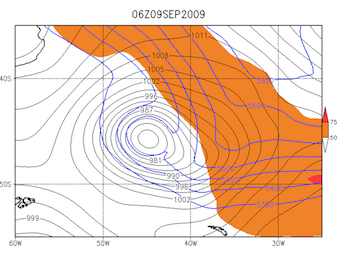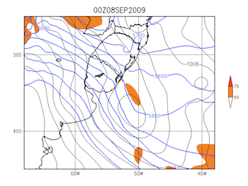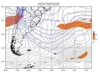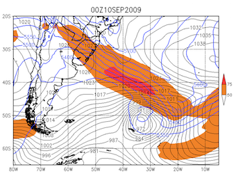 07-10 September 2009. Mean sea level pressure (black contours), 500/1000 hPa thickness (blue contours) and 300 hPa wind isotachs above 50 m/s (orange and red shading).