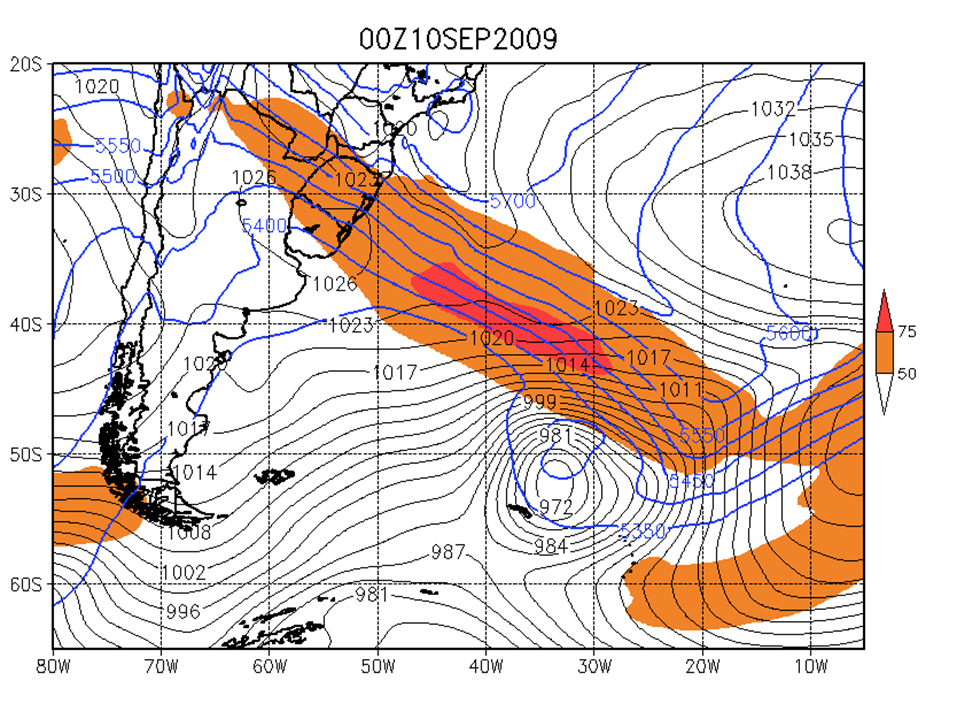 | This variable is important for identifying and tracking the cyclones. During the pre-cyclogenesis stage, there is an elongated, relatively low mean sea-level pressure area over Paraguay, southern Brazil and Uruguay. However, the actual genesis of the cyclone normally occurs over Uruguay or over the ocean (near the eastern coast of South America). During its development, the cyclone moves southeastwards and reaches maturity (occlusion phase). The decay occurs near 55°S and 35°W. |