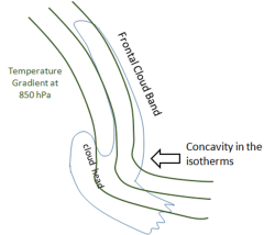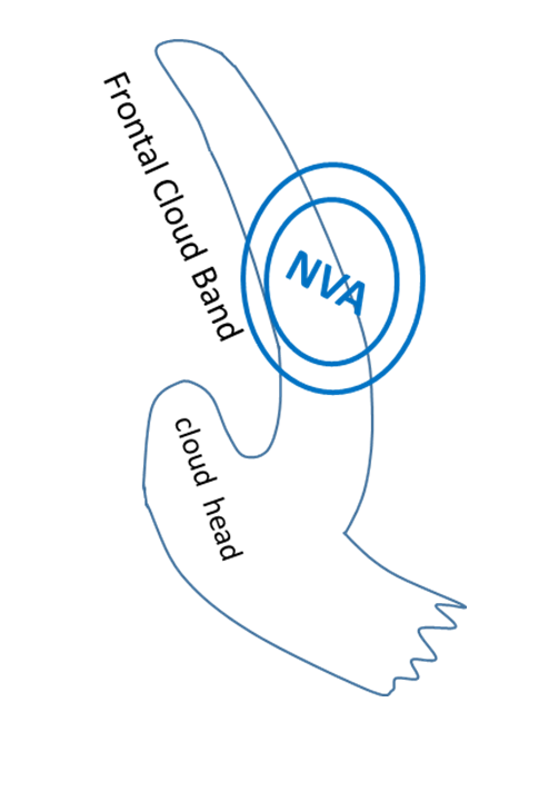 | At higher levels, maximum vorticity advection (NVA minimum) can be observed downstream of the trough axis, mostly situated within the cloud head. This advection of cyclonic vorticity at higher levels enhances ascent in the column. Maximum vorticity advection can also be found at the righthand exit of the jet streak within the main jet stream. This region shows a divergent upper pattern, which is also associated with ascent in the column. |