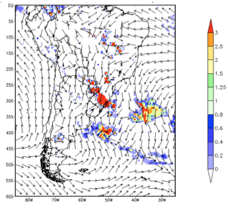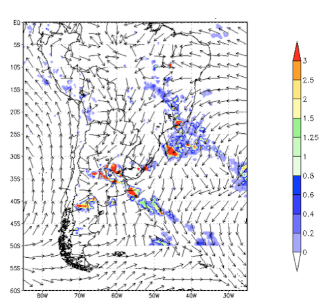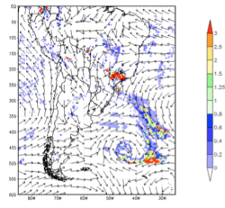 08 September 2009 /00:00 UTC Wind at 10 m (GFS analysis) and 3-hourly accumulated precipitation using TRMM Multisatellite Precipitation Analysis (TMPA) product.