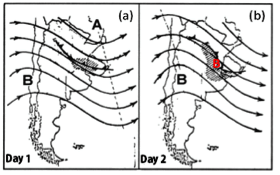 Modelo conceitual do desenvolvimento de um ciclone extratropical sobre a América do Sul. As linhas pretas com seta representam a altura geopotencial em 500-hPa; triângulos pretos e semicírculos representam frentes frias e quentes, respectivamente. As letras em negrito A e B indicam a posição dos centros de alta e baixa pressão, respectivamente, em 500 hPa e a letra vermelha B indica a posição do ciclone de superfície. As áreas sombreadas mostram a nebulosidade associada com as frentes e com o ciclone. Fonte: adapatado de Celemín (1984).