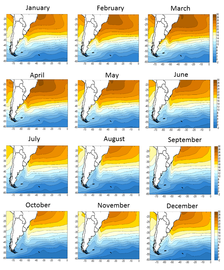 Média mensal da temperatura (°C) sobre o Oceano Atlântico Sul de 1982 a 2002. é possível identificar a confluência atual Brasil-Malvinas perto das costas do Uruguai e sul do Brasil. Fonte: Reboita (2008).