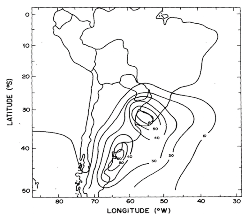 Distribuição anual de isolinhas mostrando a frequência de ciclogêneses. Fonte: Gan e Rao (1992) Densidade de ciclogêneses entre 1990-1999. A densidade é o número de sistemas dividido por uma área de 5° x 5° de latitude-longitude e multiplicado por 104. Fonte: Reboita et al. (2010)