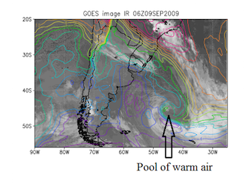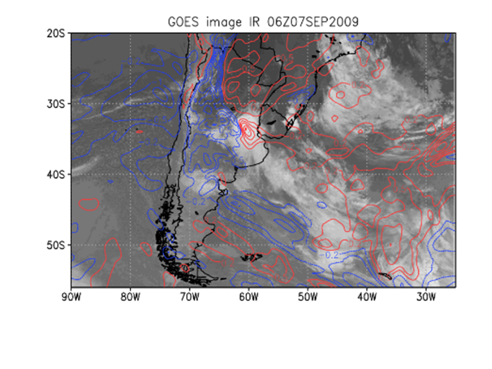 07-10 de setembro de 2009. Imagem do canal 4 IR do GOES-10 e temperatura em 850 hPa (linhas).
