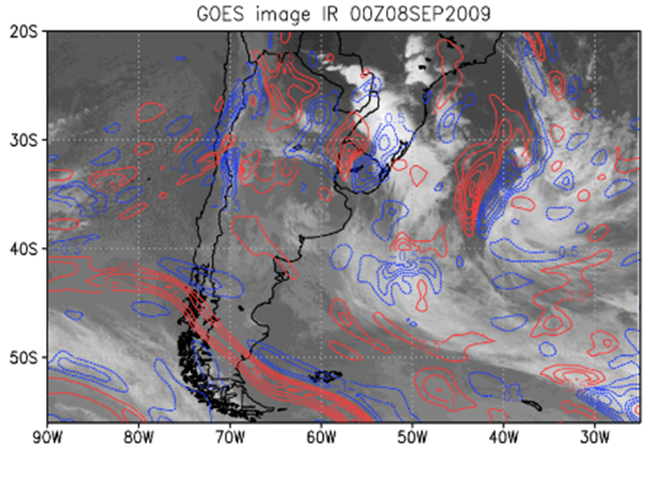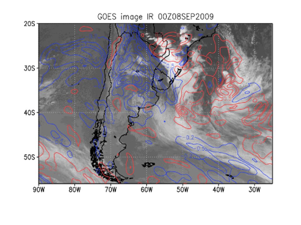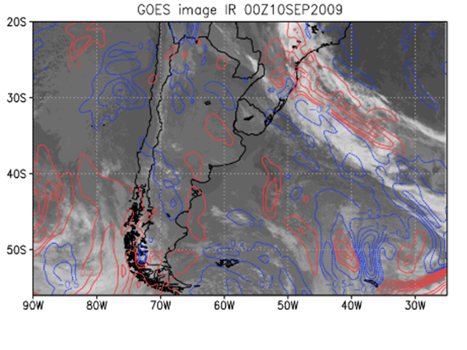 07-10 de setembro de 2009. Imagens do canal 4 IR do GOES-10. Advecção positiva (anticiclônica - linhas vermelhas); advecção negativa (ciclônica - linhas azuis). O círculo indica a região onde a NVA contribui para o movimento ascendente.