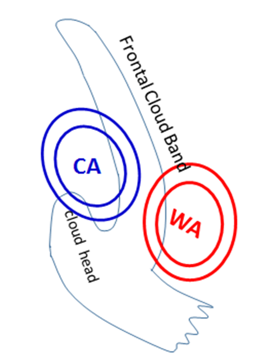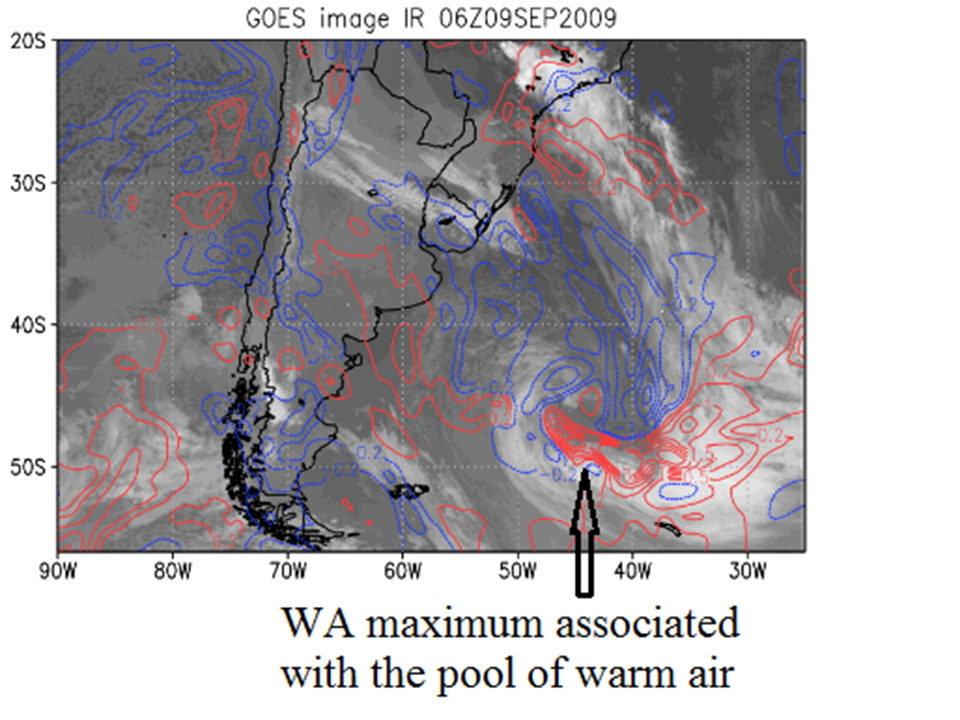 Advecção de Temperatura em 850 hPa: às vezes, os Andes podem bloquear a frente fria e permitir a intensificação da advecção do ar quente a 850 hPa (WA) da região amazônica para o lado leste dos Andes. Isso é uma condição prévia para criação de um ciclone a sotavento, apesar de também ser necessário um cavado de nível superior cruzando os Andes. O campo de advecção de temperatura mostra uma situação de onda distinta: um máximo de advecção quente (WA) adiante da nebulosidade e advecção de ar frio (CA) atrás. Esse conjunto WA/CA é um sinal da ciclogênese em andamento.