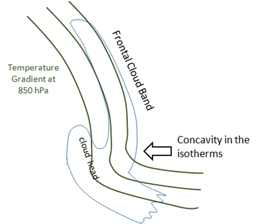 Temperatura em 850 hPa: esse parâmetro permite monitorar os gradientes horizontais de temperatura em torno do ciclone, durante a sua evolução. Nas fases de pré-ciclôgenese e ciclôgenese, há um gradiente horizontal de pressão intenso no centro do ciclone. No estágio de ciclôgenese, as isotermas mostram uma concavidade similar ao mostrado no modelo de Bjerknes e Solberg. No entanto, uma vez que o ciclone está maduro, as isotermas começam a diferir do modelo desses autores. O exemplo mostrado aqui indica uma piscina de ar quente na parte oeste dos gradientes de temperatura.