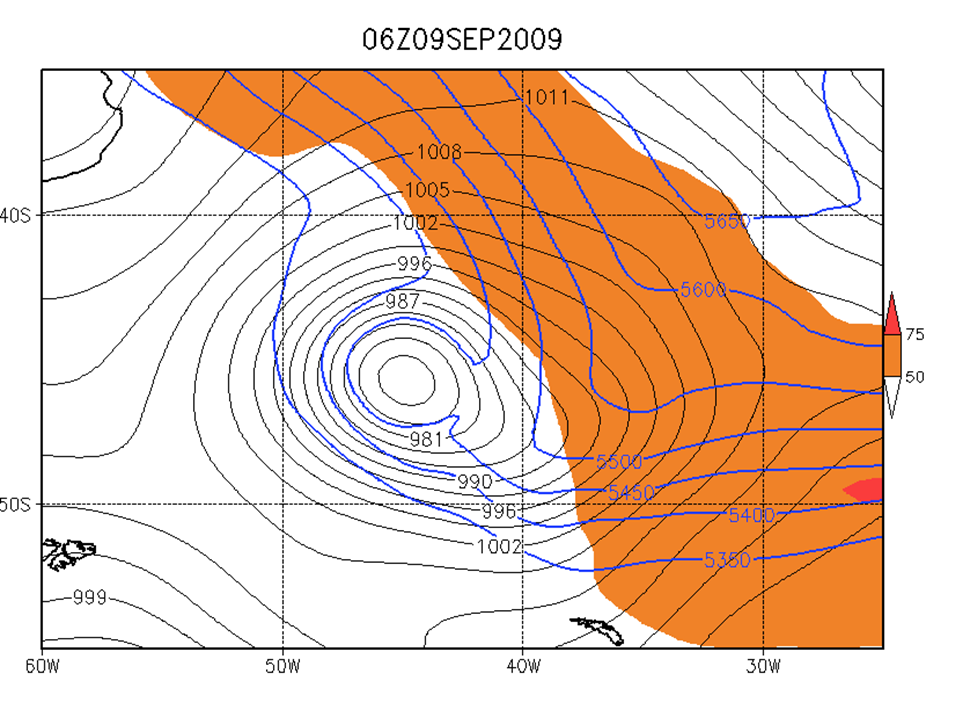 07-10 de setembro de 2009. Pressão ao nível médio do mar (linhas pretas), 500/1000 hPa de espessura (densidade) (linhas azuis) e ventos abaixo de 50 m/s em 300hPa (sombreado laranja e vermelho).