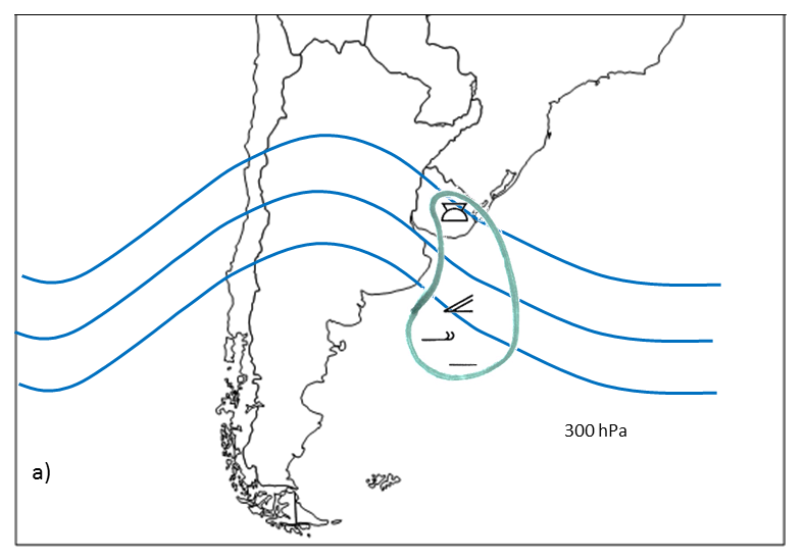 Pressão Média no Nível do Mar: essa variável é importante para identificar e rastrear os ciclones. Durante o estágio de pré-ciclogênese, há uma área alongada de baixa pressão ao nível do mar sobre o Paraguai, sul do Brasil e Uruguai. Contudo, a origem do ciclone ocorre sobre o Uruguai ou sobre o oceano (perto da costa leste da América do Sul). Durante seu desenvolvimento, o ciclone se move em direção a leste ou sudeste e atinge o estágio de maturidade (fase de oclusão). Seu enfraquecimento ocorre perto de 55°S e 35°W. Altura Geopotencial em 300 hPa: um cavado ou um vórtice ciclônico de altos níveis, deslocado do oceano Pacífico para o Atlântico, contribui para a origem do ciclone em superfície perto da costa leste da América do Sul. A ciclogênese ocorre à jusante do eixo do cavado, através de uma zona baroclínica pré-existente ou devido ao efeito orográfico (ciclogênese a sotavento) quando um jato de baixos níveis está presente. |