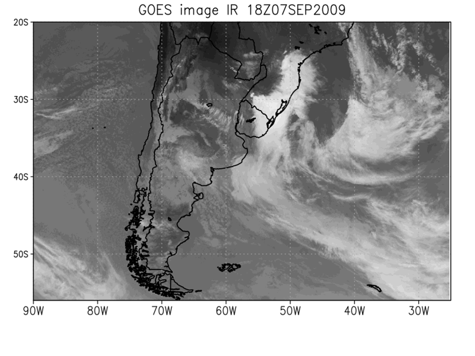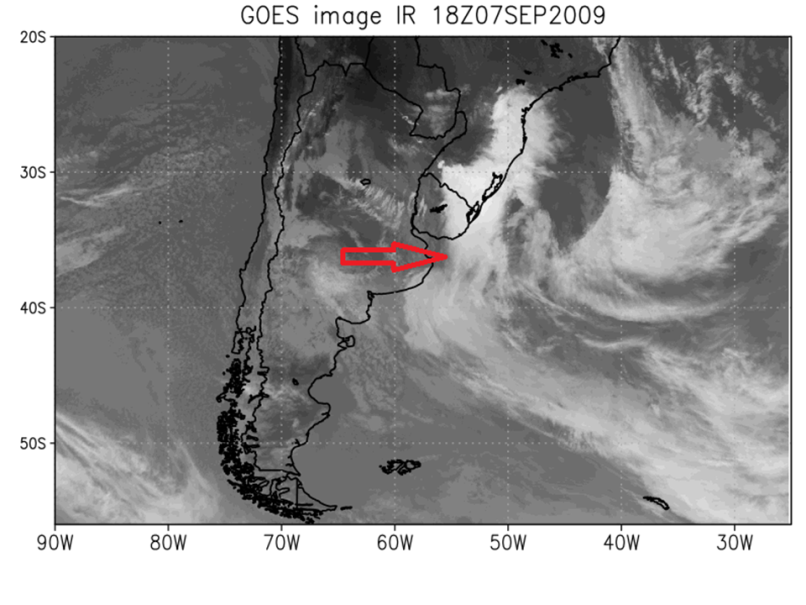 Para ilustrar os padrões das nuvens mostrados na figura abaixo, se utilizará como exemplo o ciclone que começou em 07 de setembro de 2009. Usaremos as imagens do canal 4 infravermelho e do canal 3 de vapor d'água (6.7) do satélite GOES10 para mostrar os vários estágios de desenvolvimento das nuvens durante o ciclo de vida do ciclone.