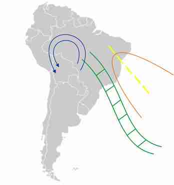Typical configuration at high levels: an anticyclonic circulation (Bolivian high - blue lines) over northwestern South America and a trough over northeastern Brazil (orange and yellow lines).