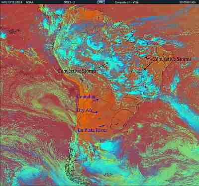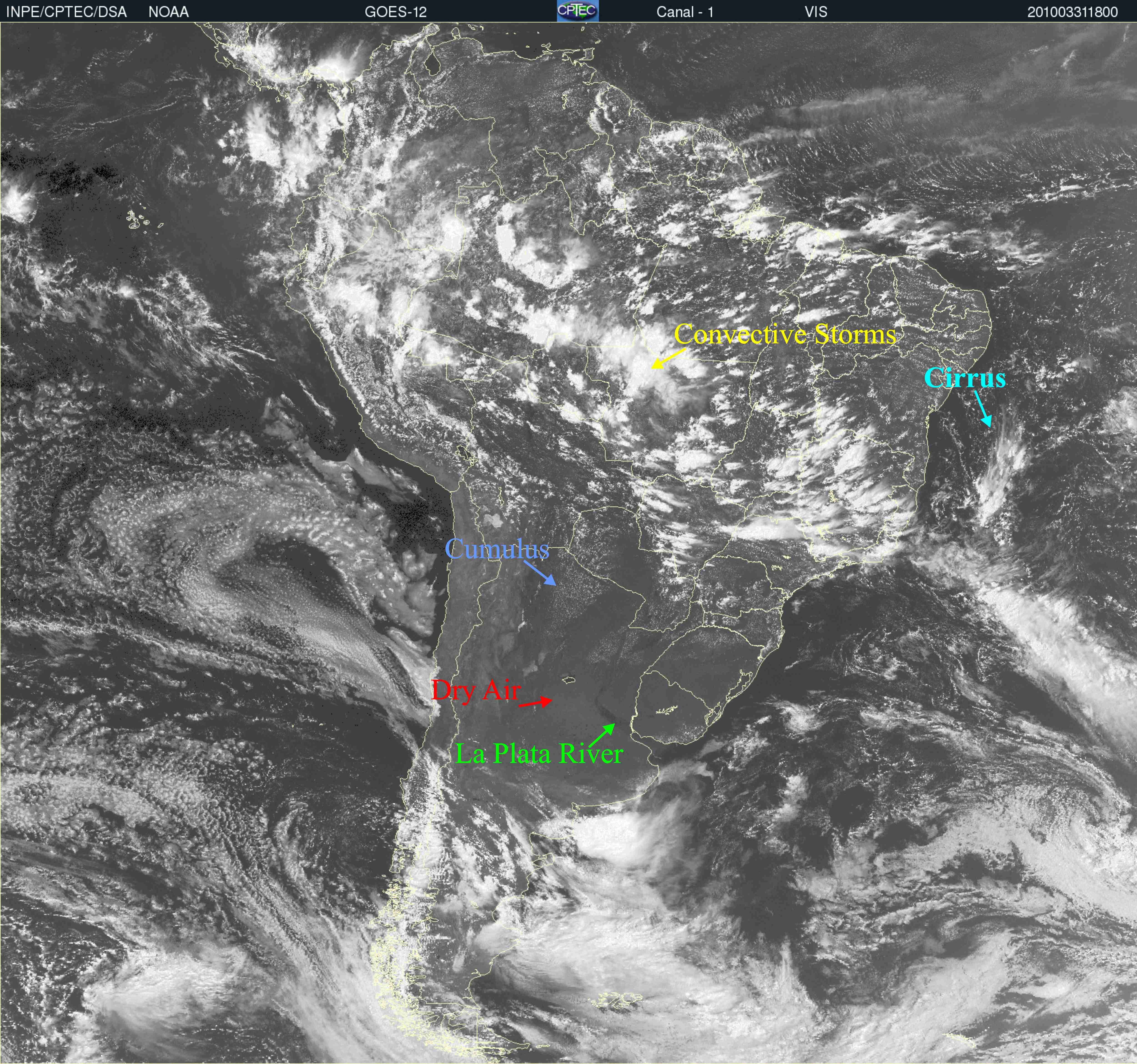 - Northeastern Brazil and Argentina and southern Brazil have clear skies or small cumulus clouds, as seen in the VIS image.