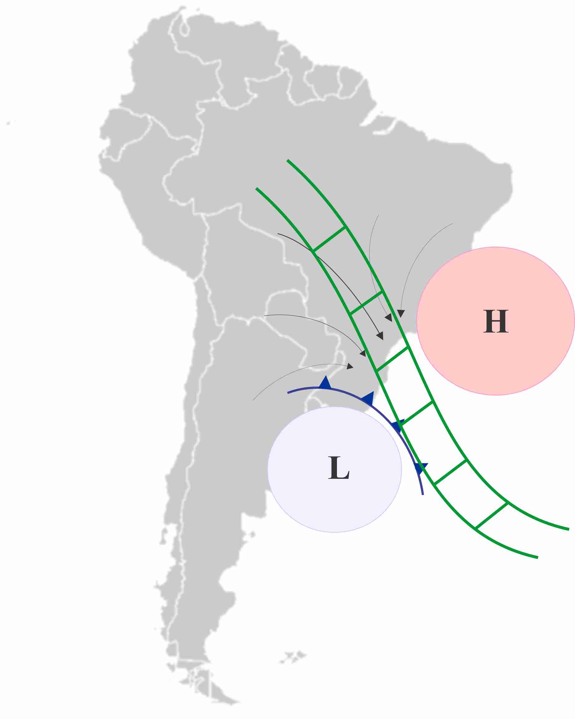 Typical positions of the SACZ (green) and the quasi-stationary surface frontal system (the low and the cold front), and convergence of low-level winds.