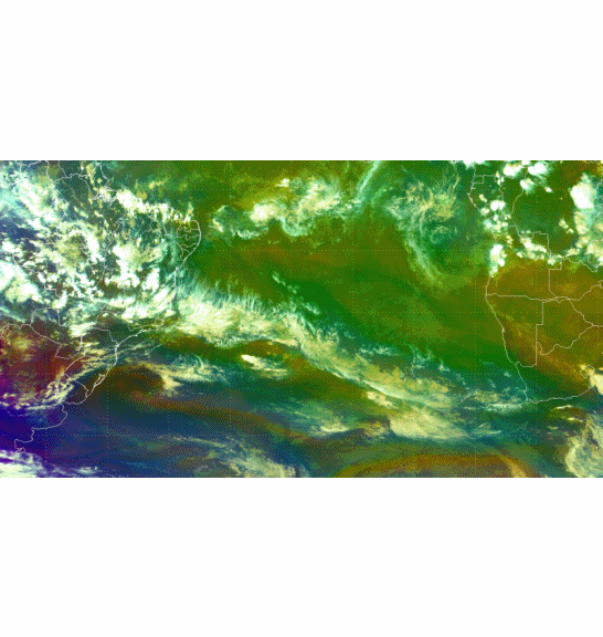 - The combination of IR and VIS channels emphasizes the deep convection within the SACZ (bluish colors) while the orange and red hues represent clear skies around it.