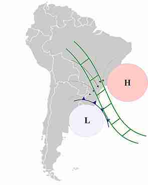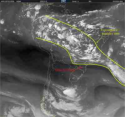 - An elongated zone of clouds, precipitation, and convergent winds with a northwest-southeast orientation across southeastern Brazil to the southwestern Atlantic Ocean. It can be seen on the VIS, IR and WV-channels.