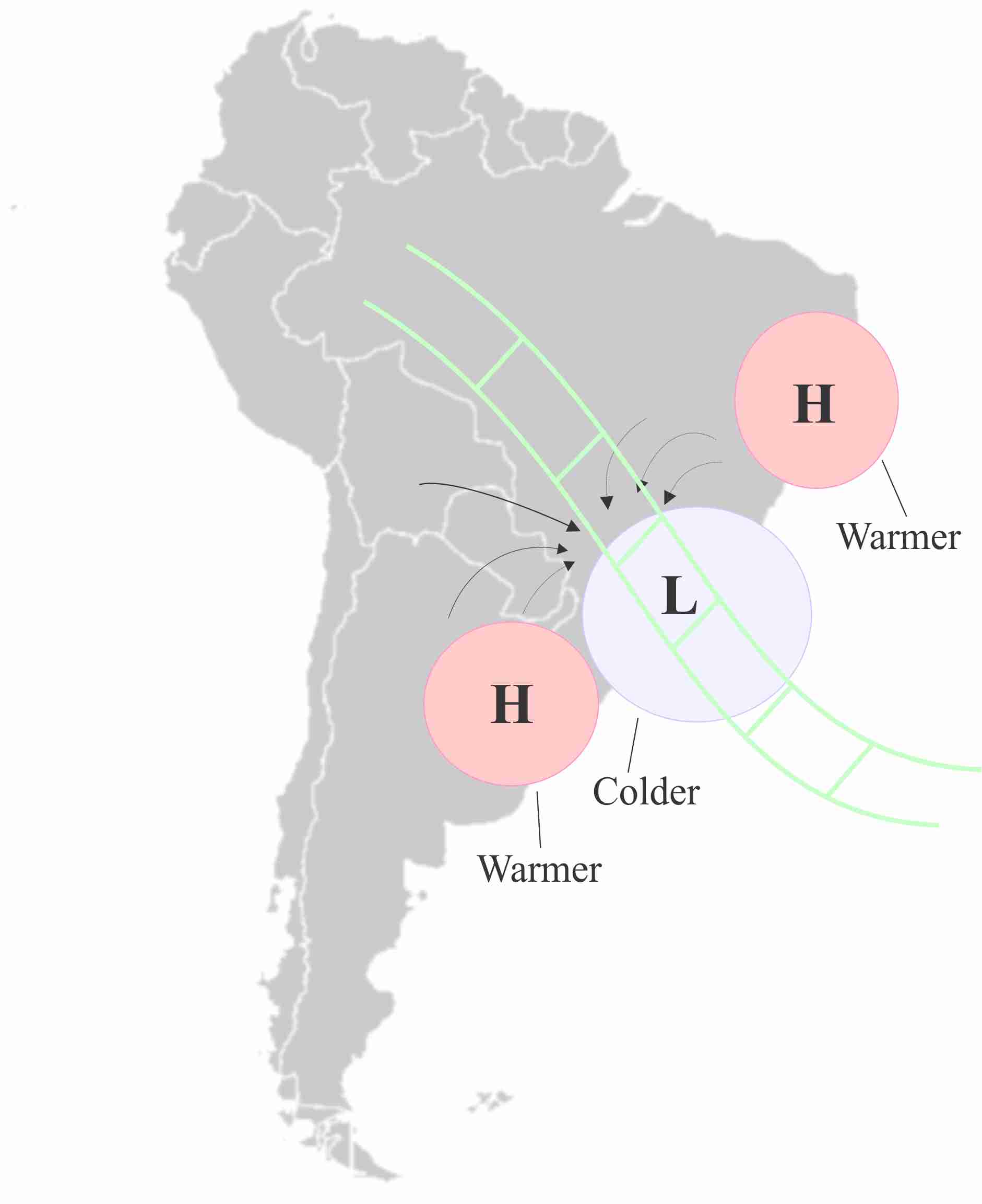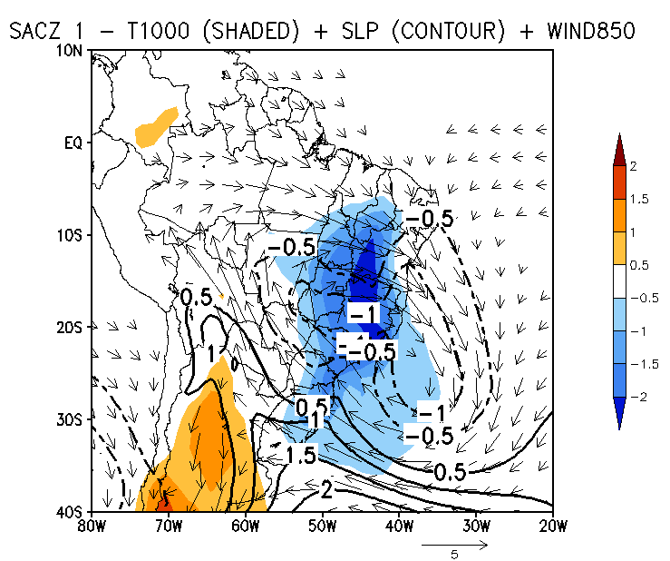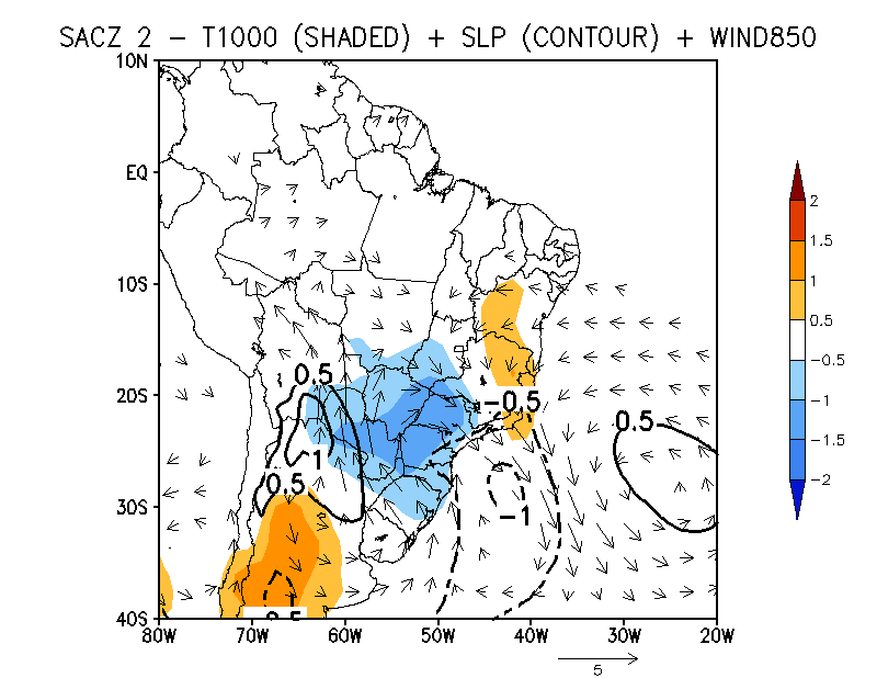 | Há uma circulação ciclônica em baixos níveis bem definida sobre o sudeste brasileiro (centrada sobre o estado do Espírito Santo), acompanhada por anomalias negativas de pressão atmosférica média ao nível do mar e convergência do vento. O fluxo de vento em baixos níveis advém da região Amazônica transportando umidade para a região sudeste. Há também uma anomalia negativa de temperatura sobre a região. Como visto no capítulo anterior, os campos de pressão e temperatura possuem dois pólos e a zona de convergência fica ao norte de sua posição média. | Há uma circulação ciclônica sobre o sudeste do Brasil (centrada sobre São Paulo), acompanhada por anomalias negativas fracas de pressão atmosférica média ao nível do mar e temperatura. O fluxo de vento e as anomalias são menos proeminentes do que no Tipo 1, porém há um fluxo do Atlântico para o continente. Como visto no capítulo anterior, os campos de pressão e temperatura possuem 3 pólos e a zona de convergência fica perto da posição média. |