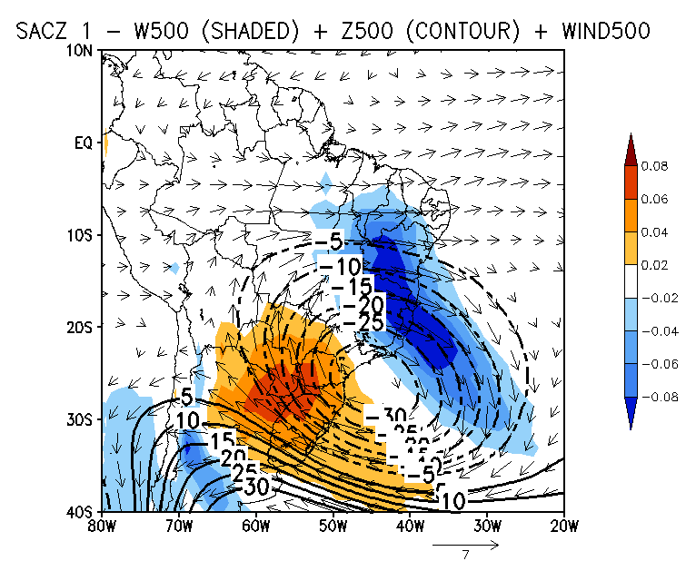 | Geopotencial a 500hPa mostra a circulação de escala sinótica da ZCAS. Há valores negativos de ômega sobre a parte leste da circulação, o que significa que há movimento ascendente na troposfera média e convergência em baixos níveis. Assim, há movimento descendente sobre o sudeste brasileiro. | As anomalias de geopotencial a 500hPa são mais fracas que no Tipo 1. Os movimentos ascendentes estão localizados sobre o estado de São Paulo. O fluxo de vento básico consiste de componentes vindas da Amazônia e do oceano Atlântico. |