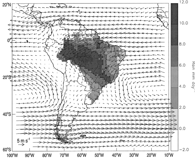 Figura 1: Média diária de precipitação no verão (dezembro-fevereiro) calculada com uma grade de tamanho de 2° lat/lon (área sombreada) e vetores de vento a 850hPa. Figura 2: Eventos meteorlógicos típicos dentro da ZCAS: tempestades, precipitação leve à intensa.