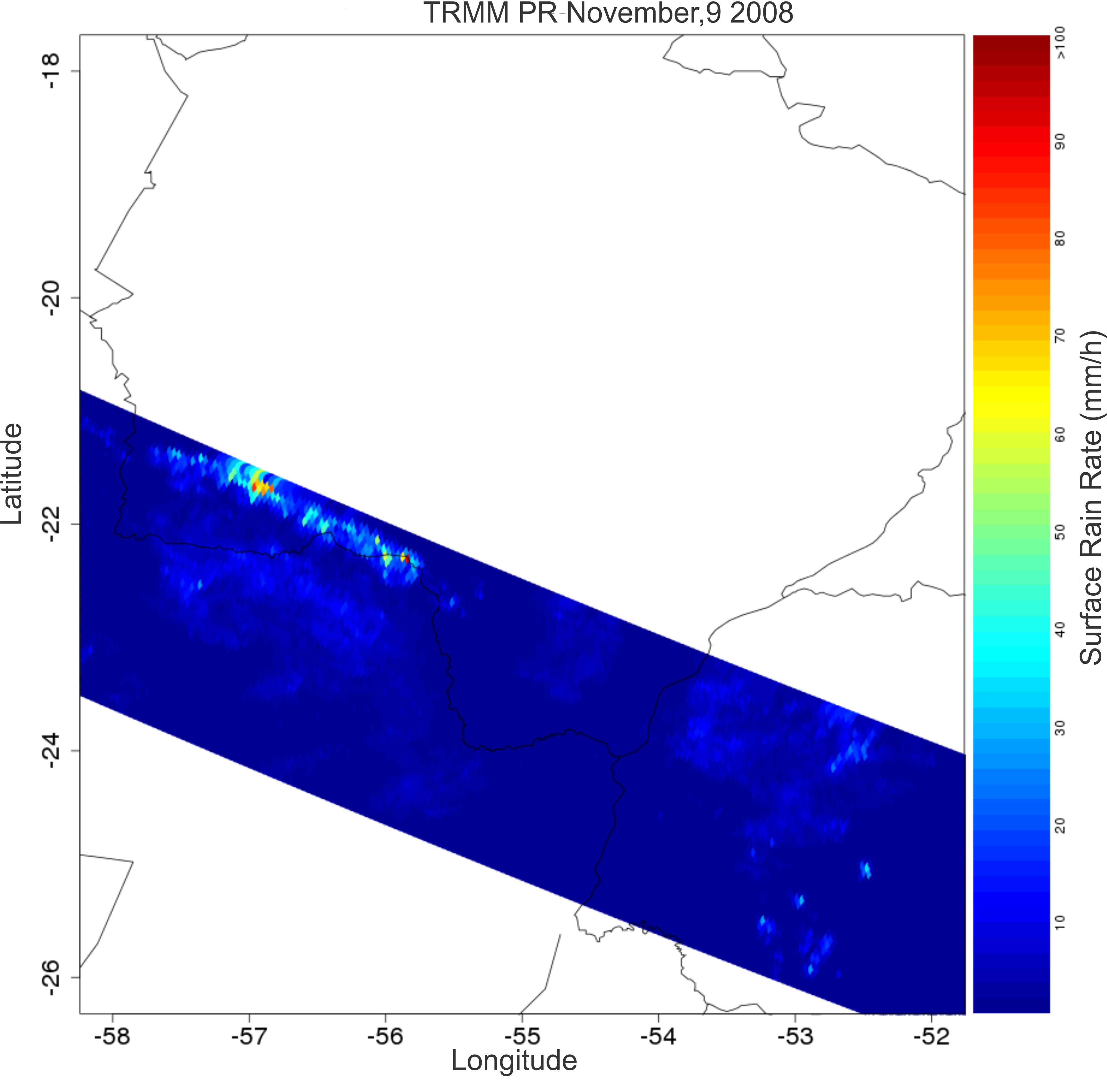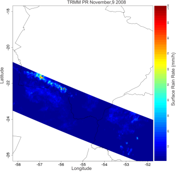 November, 9 2008 14:21 UTC - TRMM-PR - Surface rain rate (mm/h).