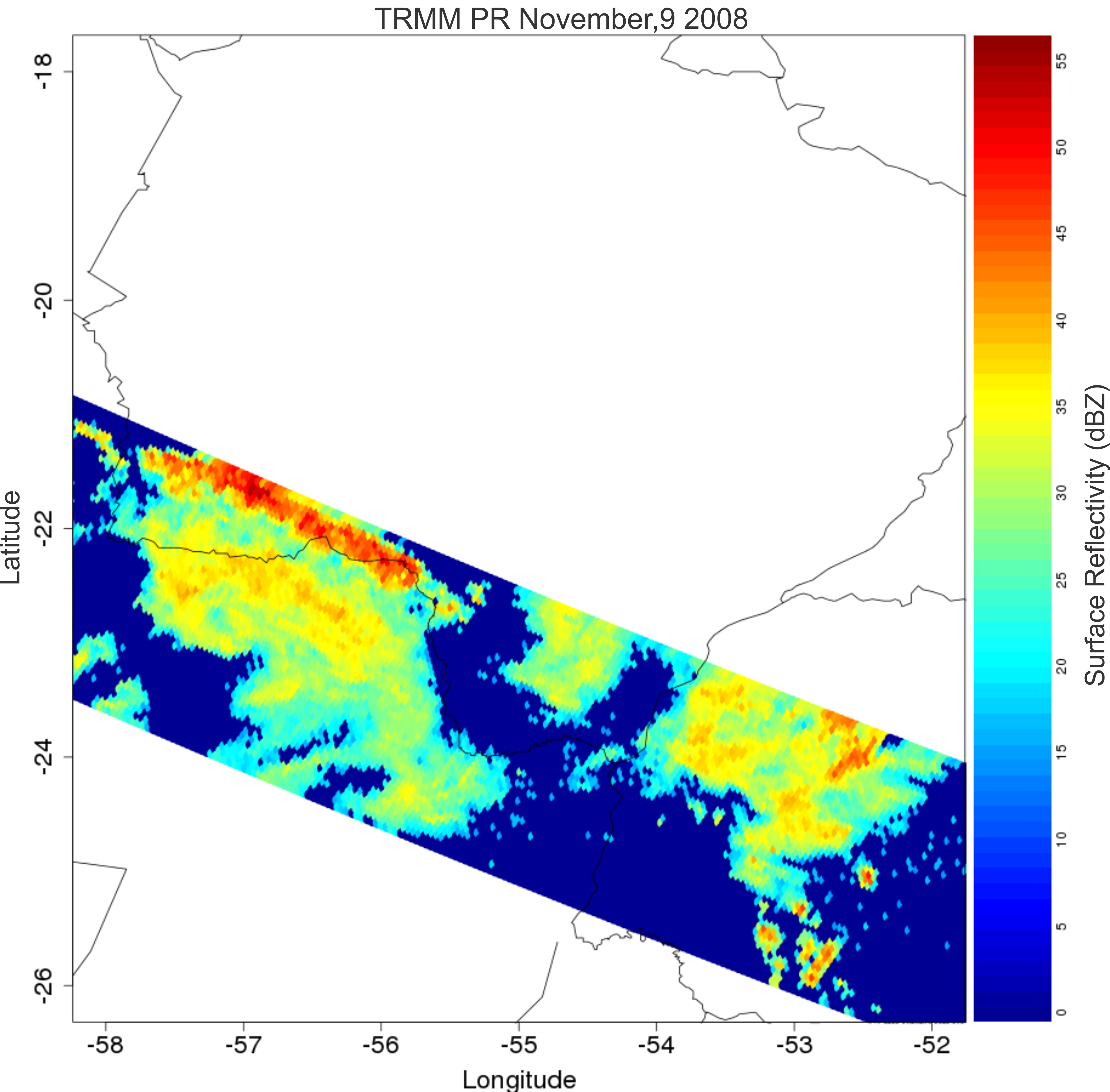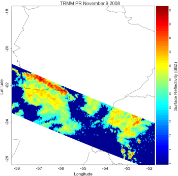 It is possible to analyze the reflectivity from the PR on board the TRMM. Reflectivity (designated by the letter Z) is the amount of transmitted power returning to the radar. It covers a wide range of signals. The dBZ values (decibels of Z) increase as the strength of the signal received by the radar increases.
