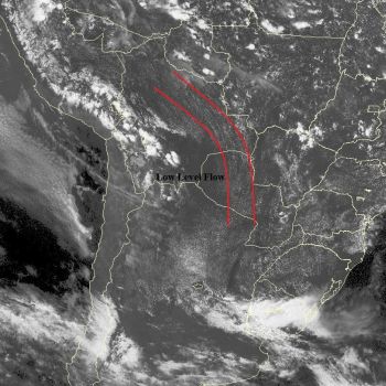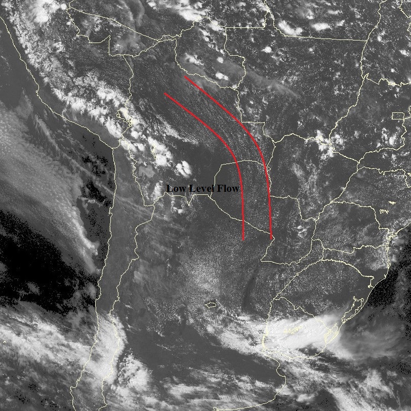 MCC are generally accompanied by a LLJ. The presence of a LLJ can be seen in VIS images on the day (or hours) before the MCC forms. As explained in the SALLJ conceptual models made by CoE Argentina, there are cloud streets organized into lines parallel to the low-level wind resulting from convective rolls within SALLJ.
