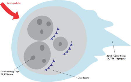 these systems are organized clusters of deep convective clouds. They typically have a circular shape and cover an extensive area. They have a low brightness temperature and a high temperature gradient at the edges, which are visible in enhanced IR imagery. Due to deep convection, MCC have bright cold cloud tops in IR and WV and high albedo in VIS images. VIS images often reveal overshooting tops in the MCC, which, when seen in combination with enhanced IR images, makes it possible to identify the most convective and active parts of the MCC.