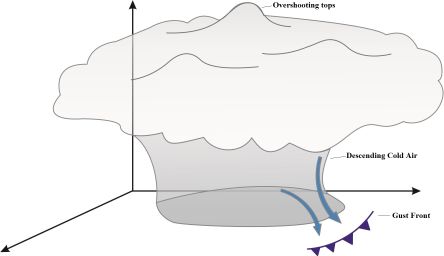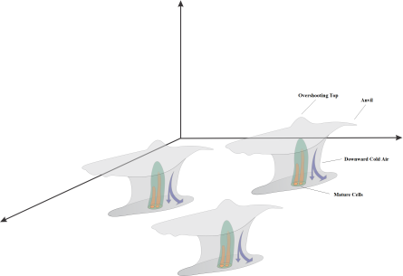 Mature stage of a MCC: nearly circular cluster of convective storms. Descending cold air creates gust fronts around the cluster, especially ahead of it.