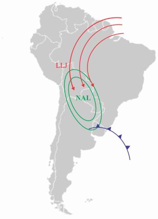 Schematic of the synoptic situation for the formation and development of MCCs. Low-level jet (LLJ), Northeast Argentinan Low (NAL) and a cold front passing southern South America.