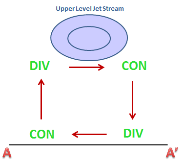 Riehl's model for a high-level jet core and the locations of convergence and divergence accompanying it.