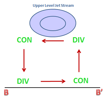 In MCC events, an upper-level jet stream decreases tropospheric stability and intensifies the formation of frontal systems. A dynamical connection between upper and lower levels operates trough vertical thermal circulations. The circulations can be analyzed using Riehl's model, which couples vertical velocities with meridional wind components.