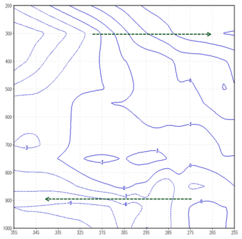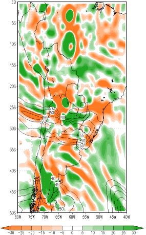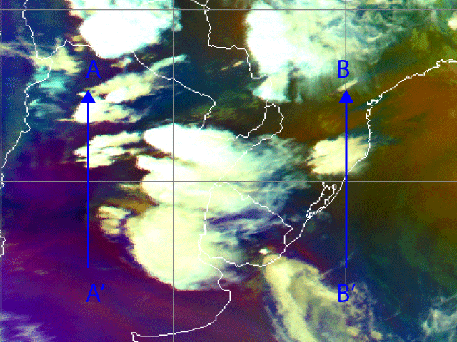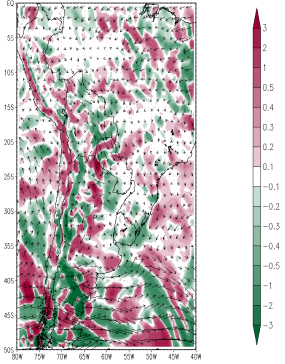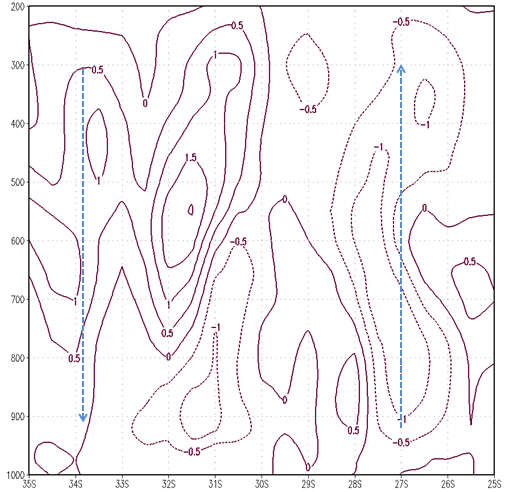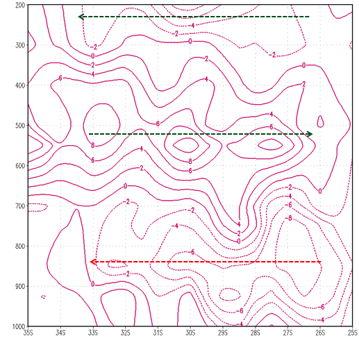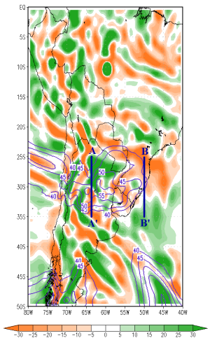 In the the cross section of vertical velocities along the line BB', there is ascending motion between 31°S and 35°S and descending motion between 22°S and 24°S (blue arrows). In this region the meridional wind components (green arrows) are not so strong as along AA', but a weak southerly component in the upper levels and a northerly component in the lower levels can be seen. The Upper Jet Stream couples the low and high level air streams through vertical circulations, which intensify the convective surface systems.